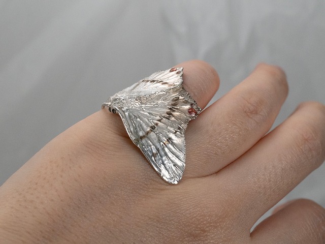 イボタガが指に止まってくれる指飾りです。 日本に広く生息している大型の蛾です。 フクロウのような大きな目玉模様が特徴的です。 お腹側もしっかり作っております。 苦手な人はとっても苦手。 好きな人はとっても好き。という印象です。 指を2本使うリングで場所を多く取ります。 お気をつけください。 ご注文の際は大体で合わせてのお送りになります。 フリーですのでご自身でも微調節して頂けます。 ・素材 真鍮 ・モチーフサイズ 35m×30㎜×25 ◆こちらは二週間以内の発送になります。