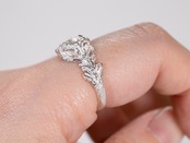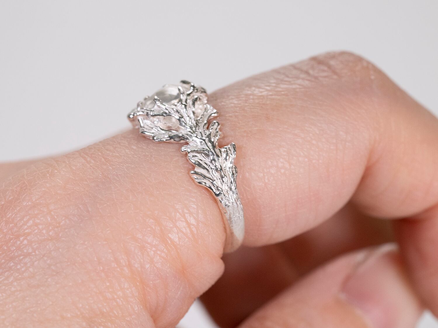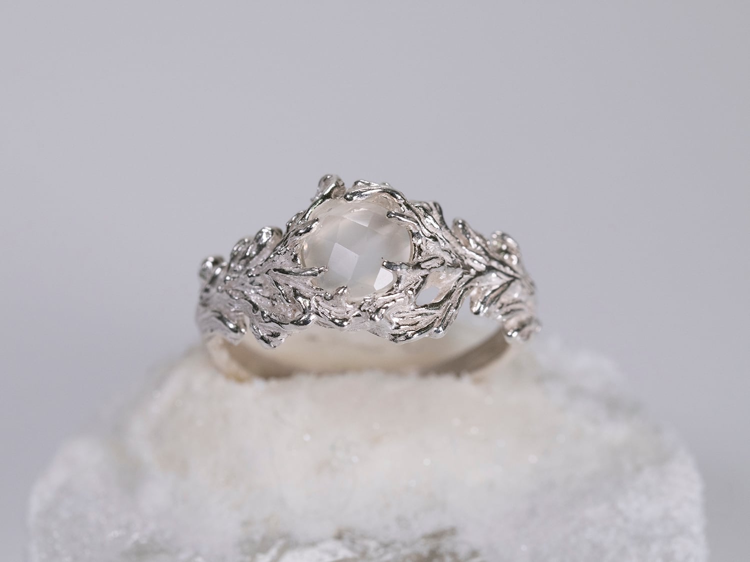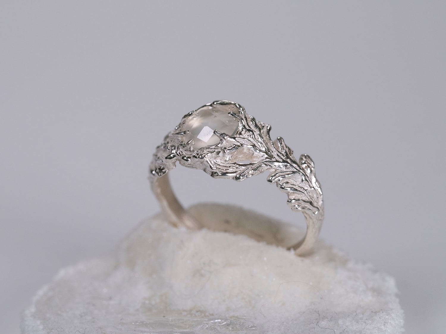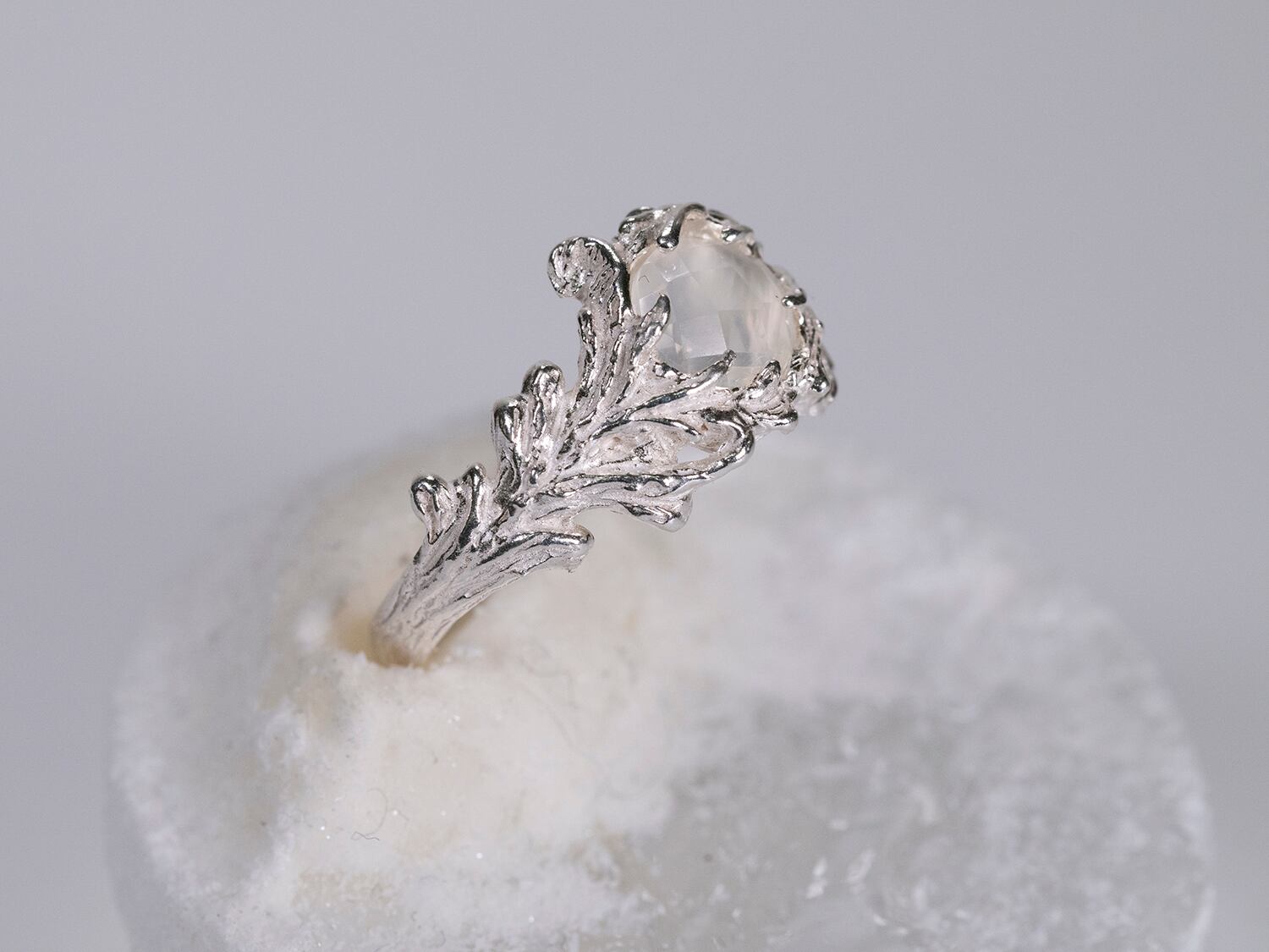 ホワイトムーンストーンが留めてあり、空気を含んだ水が徐々に凍っていく様子をイメージしました。